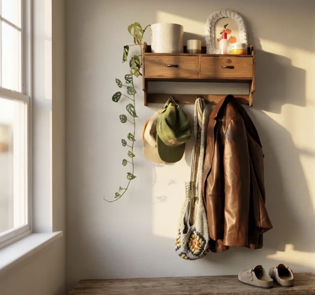 Bu ürün, rustik hem dekoratif hem de fonksiyonel bir askılıktır. Üst kısımdaki çekmeceleriyle küçük aksesuarlar düzenlemek için düzenlenebilir.